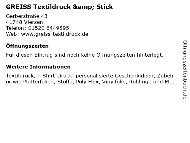 | Öffnungszeiten GREISS Textildruck & Stick in Viersen anzeigen | |