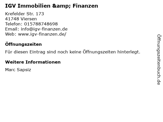 | Öffnungszeiten IGV Immobilien & Finanzen in Viersen anzeigen | |