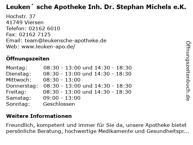 Branchen & Suchbegriffe zu Leuken´ sche Apotheke Inh. Dr. Stephan Michels e.K.:apotheke, dr., e.k., leuken´, michels, sche, stephan |