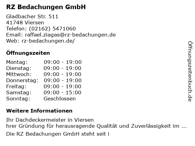 | Öffnungszeiten RZ Bedachungen GmbH in Viersen anzeigen | |