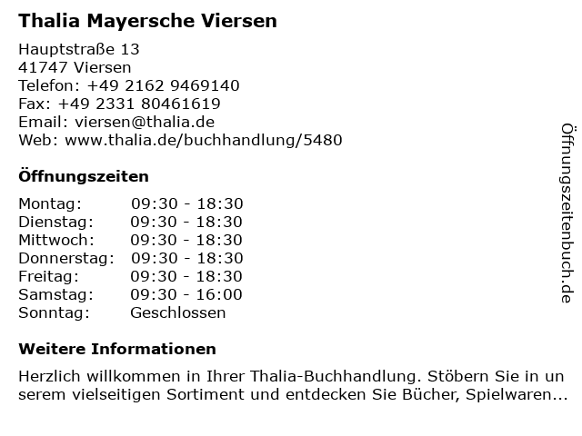 | Öffnungszeiten Thalia Mayersche Viersen in Viersen anzeigen | |