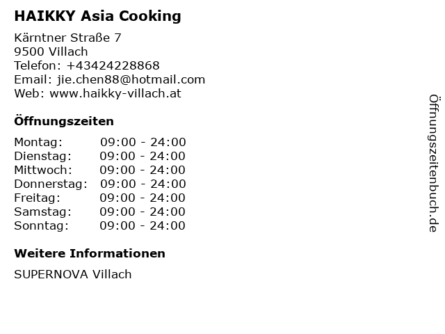 | Öffnungszeiten HAIKKY Asia Cooking in Villach anzeigen | |