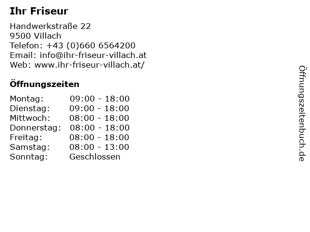 | Öffnungszeiten Ihr Friseur in Villach anzeigen | |