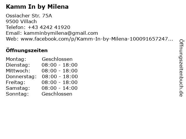 | Öffnungszeiten Kamm In by Milena in Villach anzeigen | |