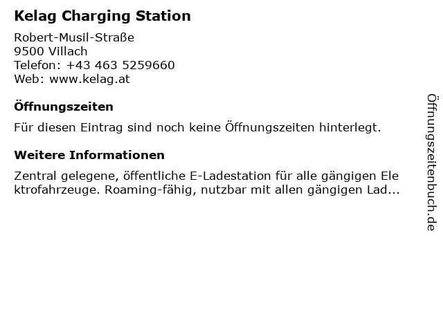| Öffnungszeiten Kelag Charging Station in Villach anzeigen | |