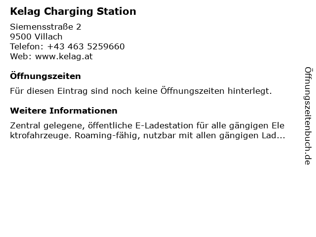 Öffnungszeiten Kelag Charging Station in Villach anzeigen