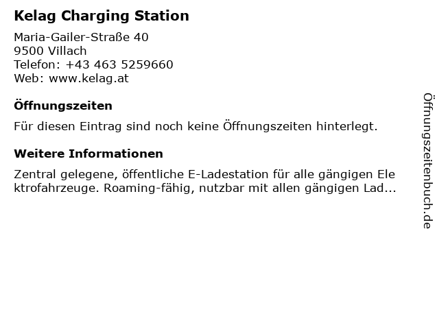 | Öffnungszeiten Kelag Charging Station in Villach anzeigen | |
