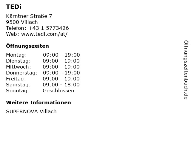 | Öffnungszeiten TEDi in Villach anzeigen | |
