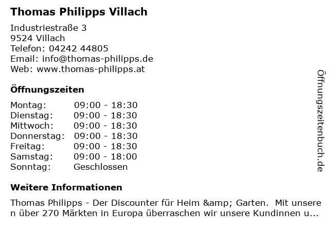 | Öffnungszeiten Thomas Philipps Villach in Villach anzeigen | |