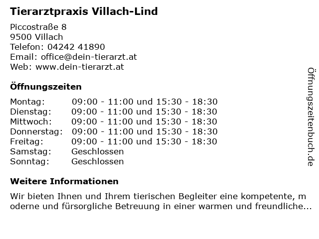 | Öffnungszeiten Tierarztpraxis Villach-Lind in Villach anzeigen | |