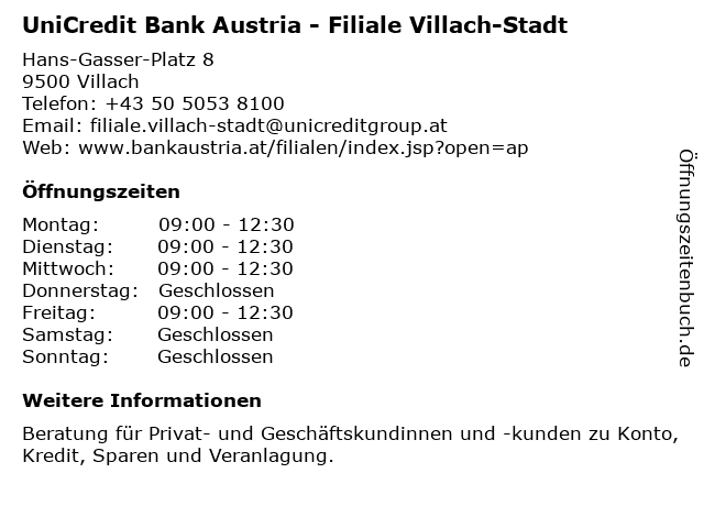 Branchen & Suchbegriffe zu UniCredit Bank Austria - Filiale Villach-Stadt:austria, bank, privat- und geschäftskundinnen und -kunden, stadt, unicredit, villach |