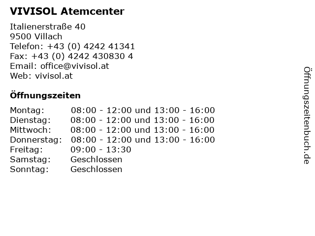 | Öffnungszeiten VIVISOL Atemcenter in Villach anzeigen | |