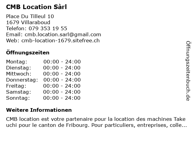 | Öffnungszeiten CMB Location Sàrl in Villaraboud anzeigen | |