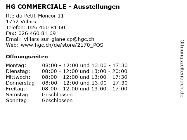1 HG COMMERCIALE - Verkaufsstellen (Entfernung: 0,00 km) Rte du Petit-Moncor 11, 1752 Villars-sur-Glâne 2 Fribourg Tourisme et Région - Oktober bis April (Entfernung: 2,20 km) Place Jean-Tinguely 1, 1701 Fribourg 3 Fribourg Tourisme et Région - Mai bis September (Entfernung: 2,20 km) Place Jean-Tinguely 1, 1701 Fribourg 6 |