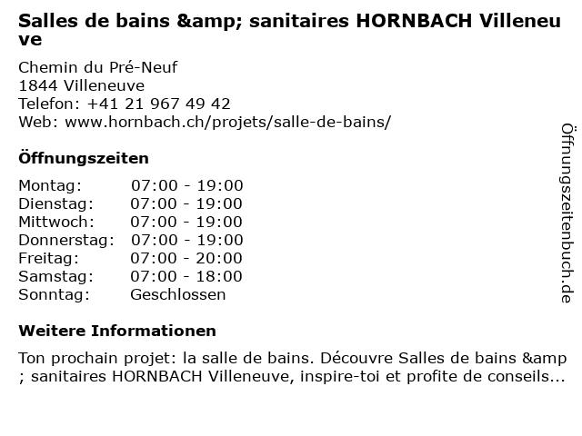 2 Matériaux de construction HORNBACH Villeneuve (Entfernung: 0,05 km) Chemin du Pré-Neuf , 1844 Villeneuve 4 5 Manfred Köhler installations sanitaires SA (Entfernung: 0,56 km) Zone Industrielle C 103, 1844 Villeneuve VD 6 Sanitas Troesch, Exposition de salles de bains Chablais (Entfernung: 13,23 km) Zone Industrielle de l'Epine 1, 1868 Collombey-Muraz  |
