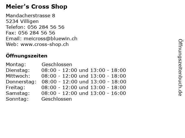 | Öffnungszeiten Meier's Cross Shop in Villigen anzeigen | |