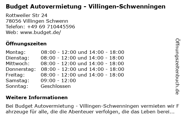 2 Avis Autovermietung - Villingen-Schwenningen (Entfernung: 0,04 km) Rottweiler Straße 24, 78056 Villingen-Schwenningen 4 A Abschleppdienst | Pannenhilfe | Autovermietung Albrecht e.K. (Entfernung: 1,40 km) Bürkstr. 81, 78054 Villingen-Schwenningen 5 Volkshochschule Villingen-Schwenningen AußenSt. Bad Dürrheim (Entfernung: 4,83 km) Schulstr. 7, 78073 Bad Dürrheim 6 ESN Energie Systeme GmbH Büro Villingen-Schwenningen (Entfernung: 5,77 km) Johannesstr. 37, 78609 Tuningen |