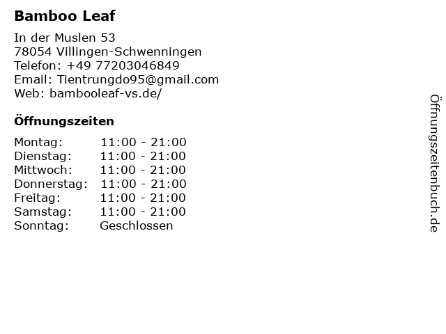 | Öffnungszeiten Bamboo Leaf in Villingen-Schwenningen anzeigen | |