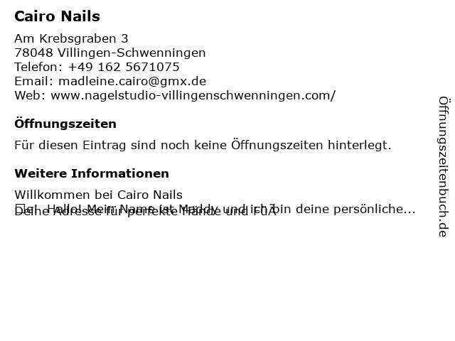 Öffnungszeiten Cairo Nails in Villingen-Schwenningen anzeigen | |