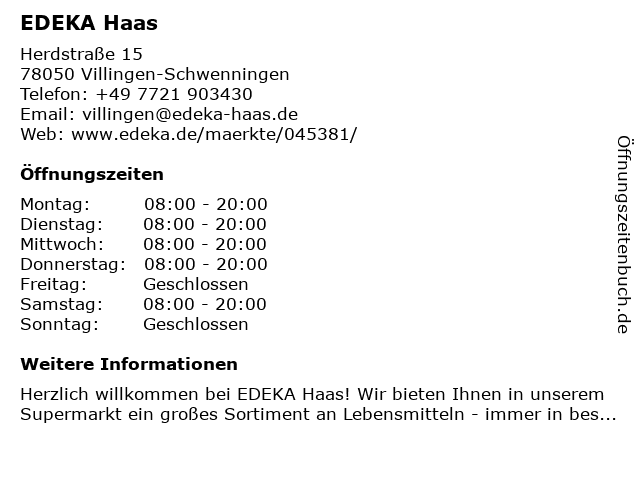 | Öffnungszeiten EDEKA Haas in Villingen-Schwenningen anzeigen | |