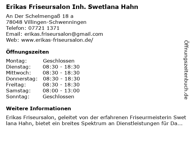 Branchen & Suchbegriffe zu Erikas Friseursalon Inh. Swetlana Hahn:erikas, friseursalon, hahn, swetlana |