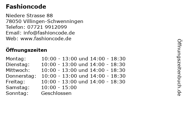 | Öffnungszeiten Fashioncode in Villingen-Schwenningen anzeigen | |