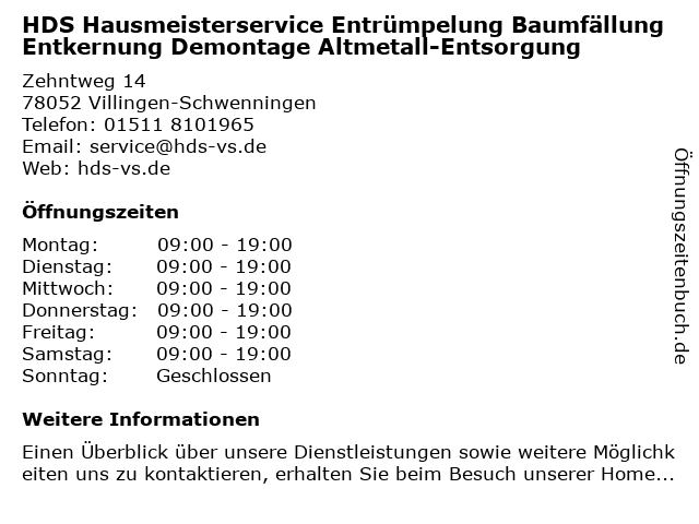 1 CURARE-IMPERIALIS Rainer Fischer Hausmeisterservice (Entfernung: 0,59 km) Kirchdorfer Str 27, 78052 Villingen-Schwenningen 5 Hausmeisterservice Richter & Güntzel (Entfernung: 4,66 km) Robert-Bosch-Str. 9, 78048 Villingen-Schwenningen 6 |