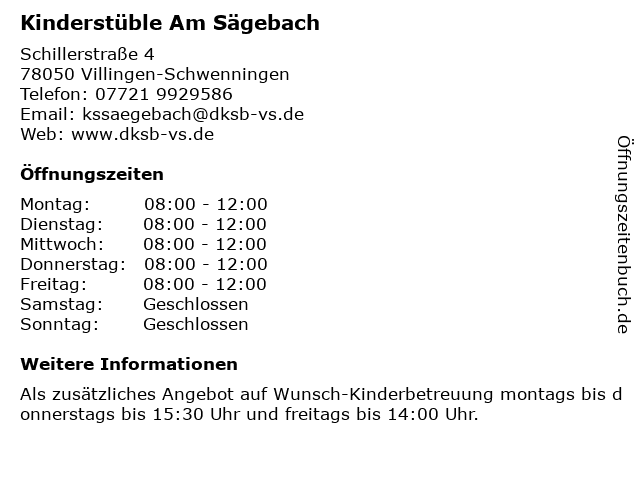 1 Kinderstüble Villingen-Schwenningen (Entfernung: 0,01 km) Schillerstr. 4, 78048 Villingen-Schwenningen 3 Katholischer Kindergarten Edith Stein (Verlängerte Öffnungszeiten) (Entfernung: 38,24 km) Hirschbergstraße 112/1, 72336 Balingen 6 Kindergarten Nesselwangen (Kleinkindergruppe) (Entfernung: 56,14 km) Hohenfelsstraße 28, 88662 Überlingen |