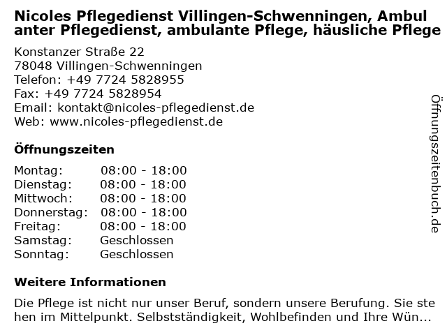Branchen & Suchbegriffe zu Nicoles Pflegedienst Villingen-Schwenningen, Ambulanter Pflegedienst, ambulante Pflege, häusliche Pflege:ambulante, ambulante pflege, ambulanter, behandlungspflege, blutzuckerkontrolle, grundpflege, hauswirtschaftliche versorgung, häusliche, häusliche pflege, insulingabe, körperpflege, medikamentengabe, medikamentenmanagement, mobilisation, nicoles, pflege, pflegedienst, schwenningen, transfer, verhinderungspflege, wohnen zu hause, wundversorgung |