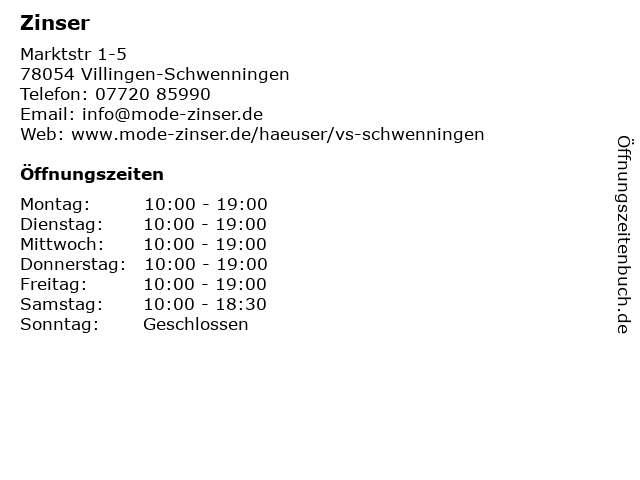| Öffnungszeiten Zinser in Villingen-Schwenningen anzeigen | |
