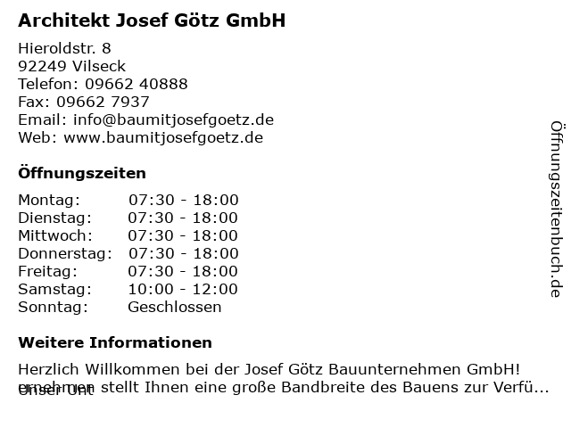 | Öffnungszeiten Architekt Josef Götz GmbH in Vilseck anzeigen | |