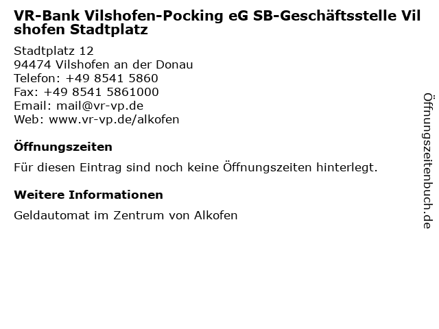| VR-Bank Vilshofen-Pocking eG SB-Geschäftsstelle Vilshofen Stadtplatz anrufen | |