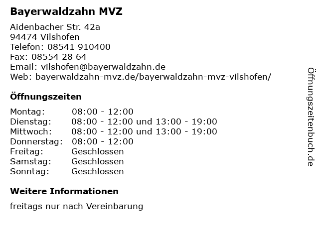 | Öffnungszeiten Bayerwaldzahn MVZ in Vilshofen anzeigen | |
