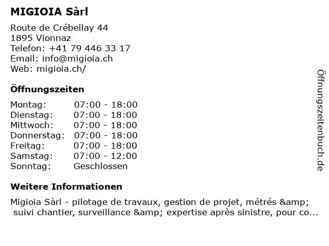 | Öffnungszeiten MIGIOIA Sàrl in Vionnaz anzeigen | |