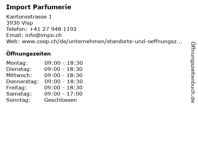 | Öffnungszeiten Import Parfumerie in Visp anzeigen | |