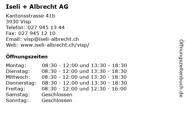 | Öffnungszeiten Iseli + Albrecht AG in Visp anzeigen | |