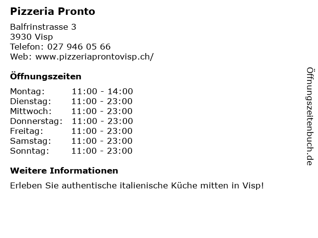 | Öffnungszeiten Pizzeria Pronto in Visp anzeigen | |