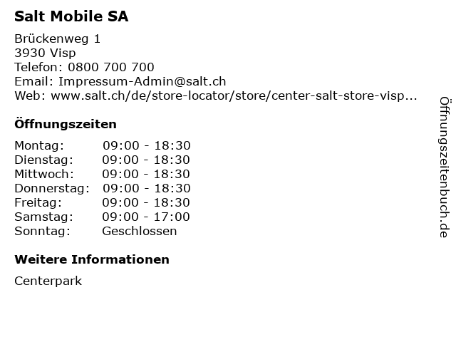 | Öffnungszeiten Salt Mobile SA in Visp anzeigen | |