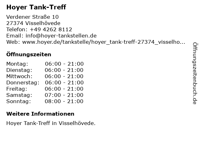 | Öffnungszeiten Hoyer Tank-Treff in Visselhövede anzeigen | |