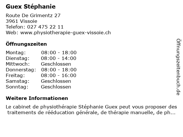 | Öffnungszeiten Guex Stéphanie in Vissoie anzeigen | |