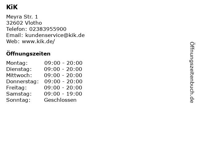 | Öffnungszeiten KiK in Vlotho anzeigen | |