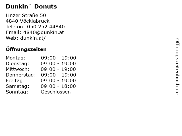 | Öffnungszeiten Dunkin´ Donuts in Vöcklabruck anzeigen | |