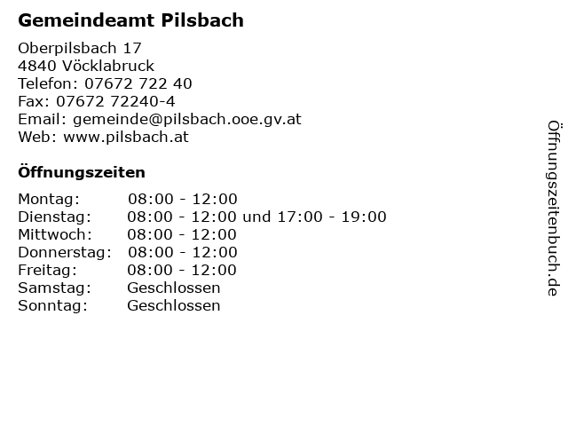 | Öffnungszeiten Gemeindeamt Pilsbach in Vöcklabruck anzeigen | |