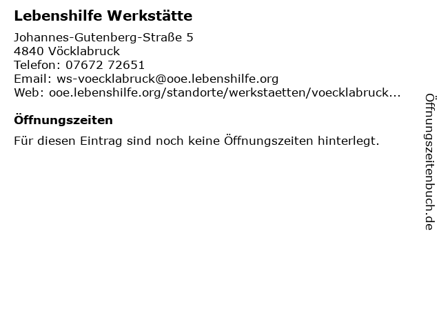 | Öffnungszeiten Lebenshilfe Werkstätte in Vöcklabruck anzeigen | |