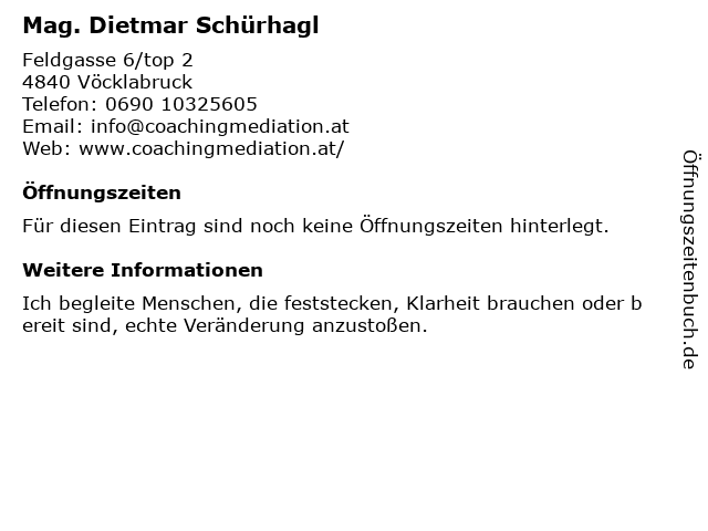 | Öffnungszeiten Mag. Dietmar Schürhagl in Vöcklabruck anzeigen | |