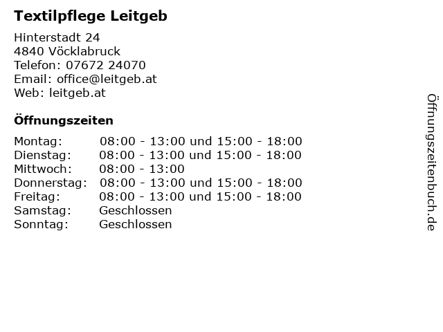 | Öffnungszeiten Textilpflege Leitgeb in Vöcklabruck anzeigen | |