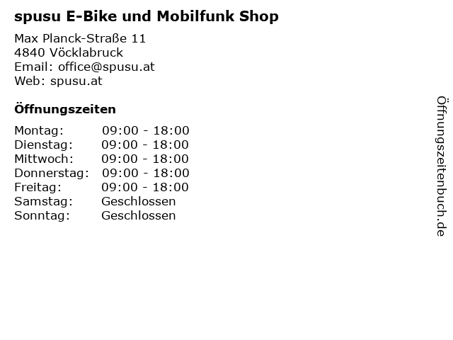 | Öffnungszeiten spusu E-Bike und Mobilfunk Shop in Vöcklabruck anzeigen | |