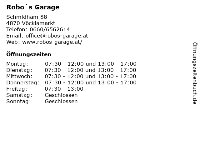 | Öffnungszeiten Robo`s Garage in Vöcklamarkt anzeigen | |