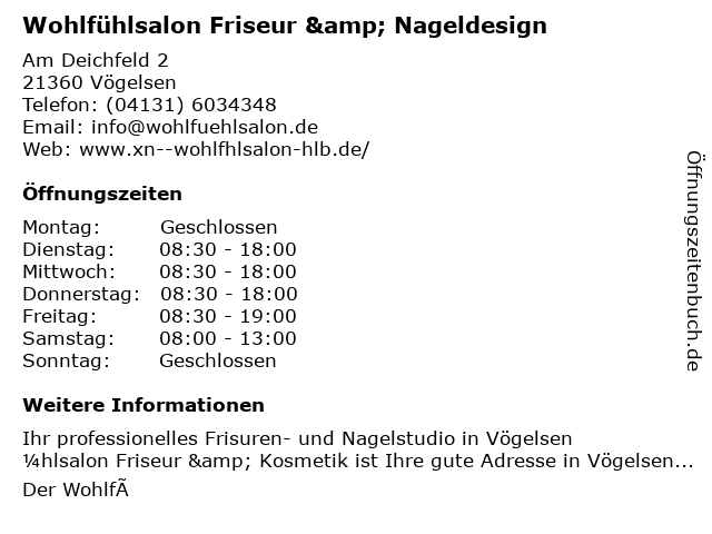 Branchen & Suchbegriffe zu Wohlfühlsalon Friseur & Nageldesign:abendfrisuren, augenbrauenzupfen, brautfrisuren, damen-haarschnitt, friseur, färben der augenbrauen, färben der wimpern, haare schneiden, haarschnitt, herren-haarschnitt, hochsteckfrisuren, nageldesign, nagelmodellagen, nagelverstärkung, naturnagelaufbau, naturnagelmodellage, naturnagelverstärkung, wohlfühlsalon |