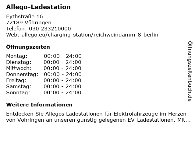 | Öffnungszeiten Allego-Ladestation in Vöhringen anzeigen | |